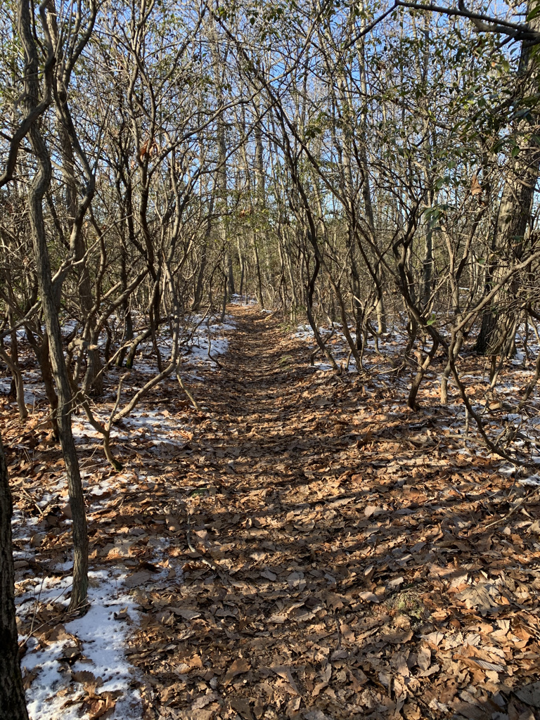 Headed back into the woods, then a short scramble up Wyanokie High Point, we found a number of small groups and pairs enjoying the view and sun on the chilly January day. (it was only after we finished our hike driving home that we saw the other overcrowded parking areas; we were fortunate to start from a smaller lot along the road, that was just filling when we arrived at 11am). Ironically, Wyanokie High Point was not our highest point of the day. We headed back into the woods, joining the red Wyanokie Circular trail, where we hit our viewless, highest point at 1,124 feet, then continued on, nearly missing our switch to the orange Outlaw Trail.