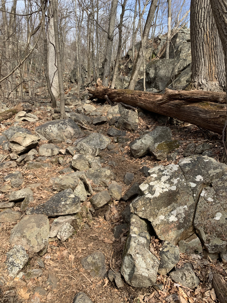 The final 2 miles when we eventually rejoined the yellow Wyanokie Crest Trail were beautiful and wild. It was less of a trail, going over boulders and water crossings, and more a free form open wood, moving blaze to blaze. I could see how the trail could be overly muddy in the spring or slick with fresh fallen snow, but the openness and solitude was just right the day we traveled it.