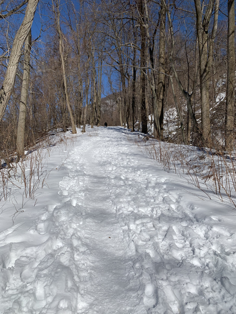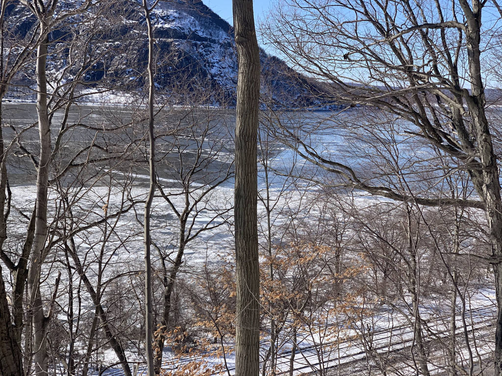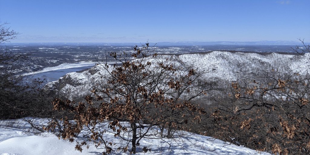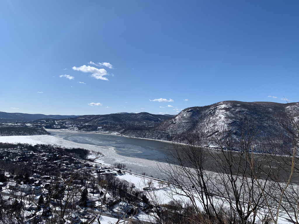 The assent was immediately uphill. I like that about the Hudson Valley. Hikes often close to the river and steeply climb to the mountains just overlooking. While hikes in the Adirondacks easily top 10-15 miles, the first quarter to third of that is often on a wide flat path to get to the actual mountain’s trailhead. I’d like to blame the fire in my calves on this new crampon experience, but no, I’m pretty sure they were just enraged with my attempt to climb after months of flat land. In less than a mile, we were high above the parking lot staring down at the frozen Hudson and waiving to Storm King Mountain across the river.