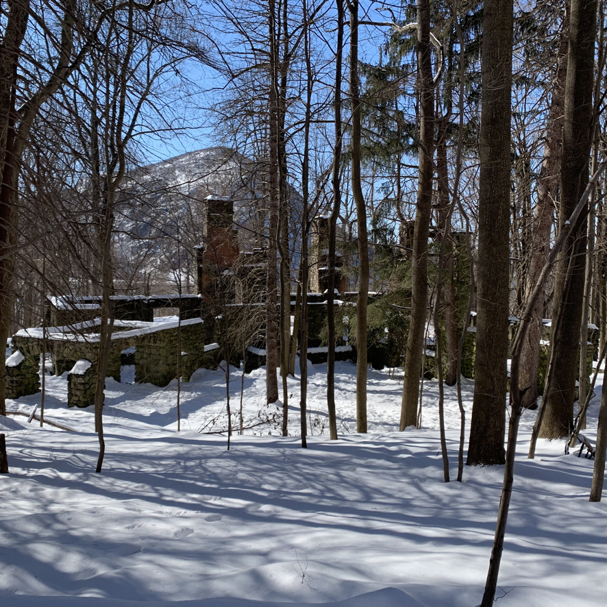 The descent was beautiful. We traveled down the shoulder of Bull Hill to a vast untouched forrest, minus the perfectly packed down trail. It always astonishes me how wild a place can be so close to civilization. With about a mile left, we hit the Cornish Trail with vast ruins of the old Stern-Cornish Estate. We looked on from afar, but in the summer, without snow, we’ve explored the ruins more closely including the main house, pool and greenhouse. Just a bit further, there’s a large cylindrical basin that is at least 10-15 feet deep. This time of year, it was more than half filled with snow. A couple years back when we visited in late summer, we found it FILLED with bull frogs, their croaks head from some distance away.