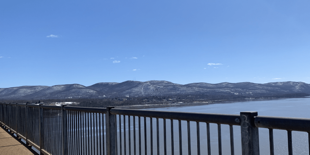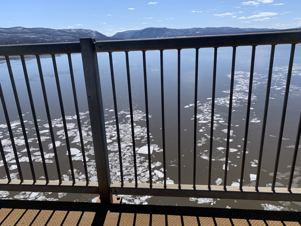 I was fine for the early portions, and the end even, but the middle… At one point we separated from the main vehicle bridge and it felt like this ad hoc extension. I logically know the structure was sound, but it just felt like an ofter thought. But oh the views. Looking down at the ice islands floating in Hudson, down river toward the city, and on each side, snow speckled mountains rising up.