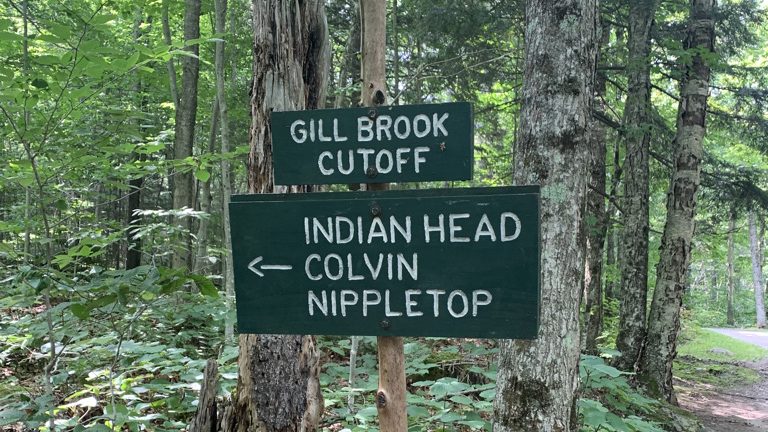 We showed up at the leisurely hour of 10:30am to start our hike. It was kind of incredible not having to wake at the crack of dawn. The trail to Indian Head is about 4.5 miles, but as with most trails from the AMR, it involves significant miles on Lake Road, a wide gravel road. Nearly 3 miles in (still with at least 500 feet of elevation gain), we turned off the road to a steady bipass trail, where we shortly intersected the Gill Brook Trail that we know well. There we stayed for .1 mile before heading right and up again climbing steadily then steeply.