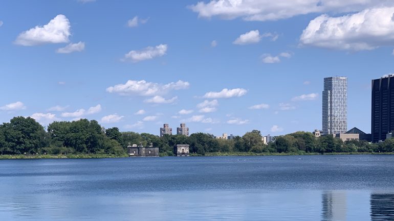 We continued up the east side of Central Park until 79th street where we crossed through, looking for evidence of the aqueduct. When we finally hit the Jackie Onassis Reservoir, we saw two gate houses on the far end.