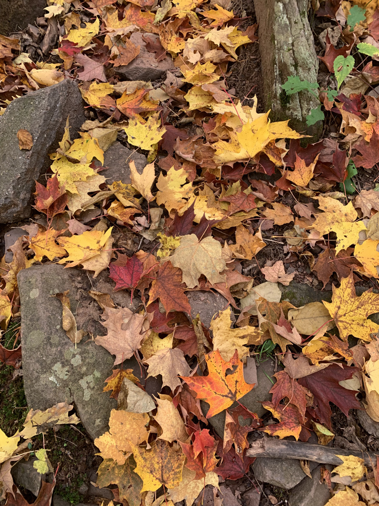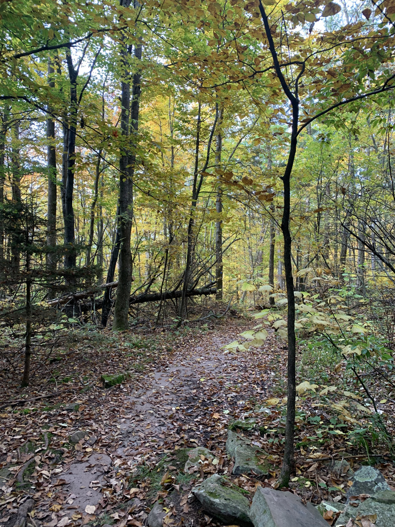 About a mile in, we intersected with and switched to the Long Path – Escarpment trail. We started to climb, but still relatively mild. At one point, it felt like we crossed into a totally different forest. Fire harvest trees behind us, then crossing a remnant stone wall, a forest of pines. Five minutes later, just as quickly as they appeared, they disappeared and we were back in the fire trees.