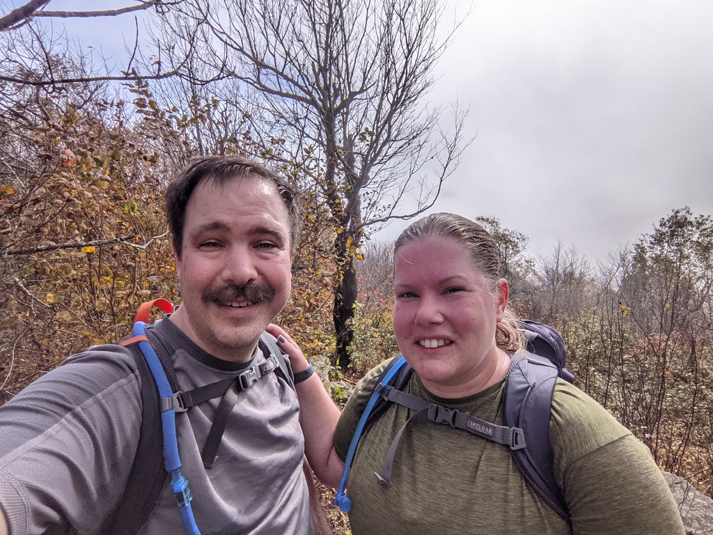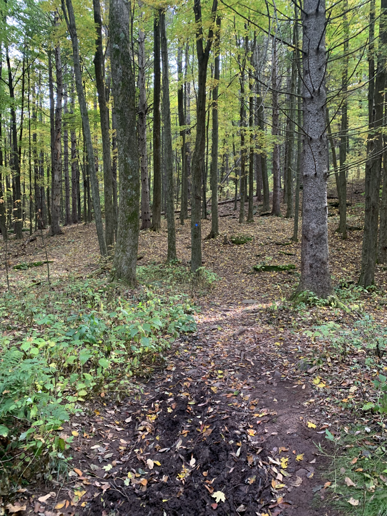When we arrived at the parking lot at 9am, we were the first car there. We had the entire mountain to ourselves. The Elm Ridge trail, which looked as it doubled as a snowmobile trail, remained relatively flat as it traveled through the woods, along a stream. Some mud to navigate around, but nothing out of the ordinary.