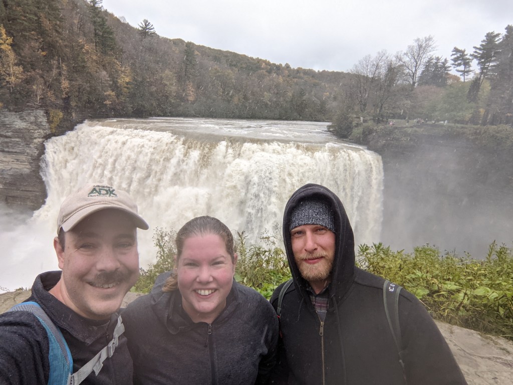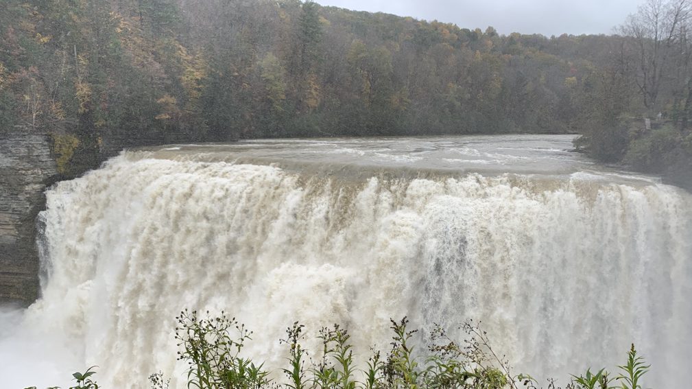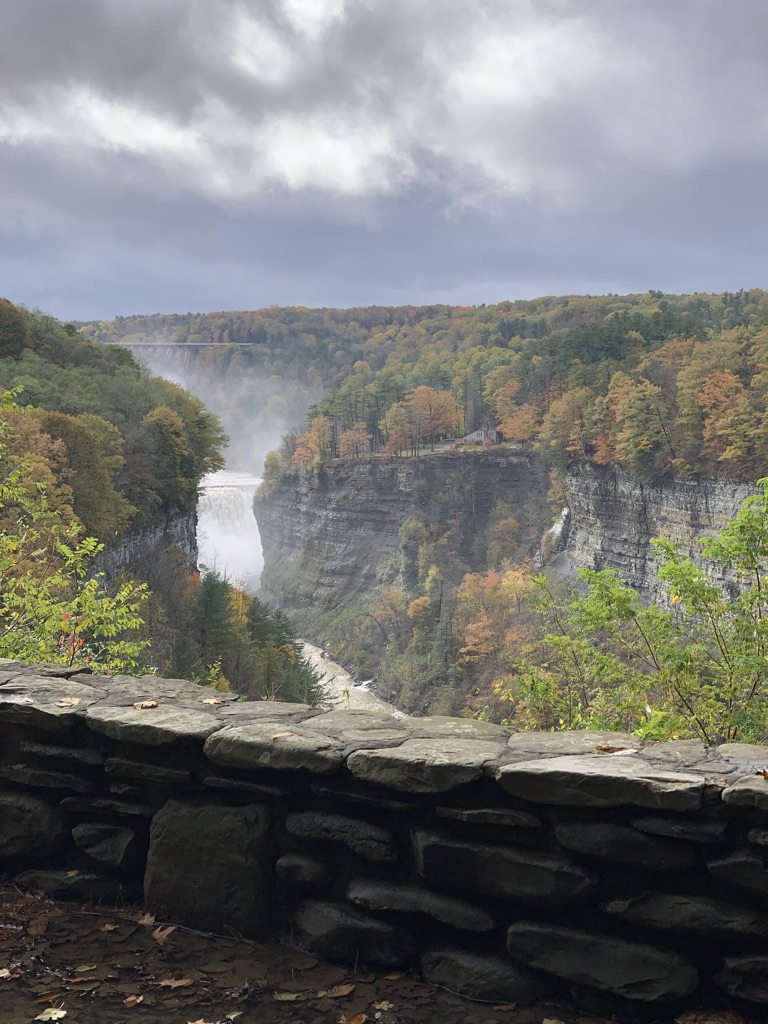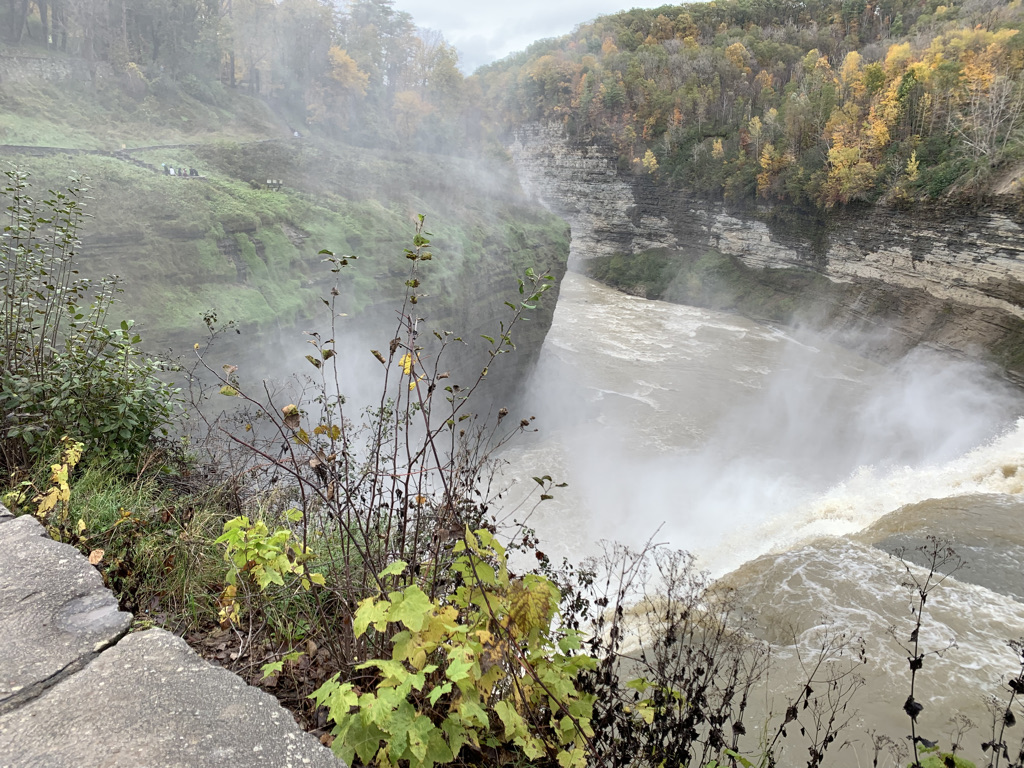 We entered through the Portageville entrance and parked by the visitor’s center. From there we took a short path to get onto the gorge trail. The trail was in no way challenging, but did offer a beautiful scenic view walking along the gorge with closer and closer views of the lower falls, upper falls and rail bridge. The most challenging part of the gorge chair might have a been the series of stone steps, wet and slippery from the spray and fall leaves. You’re able to get right up to the lower falls – Inspiration Point – but stay too long and you’ll be soaked!
