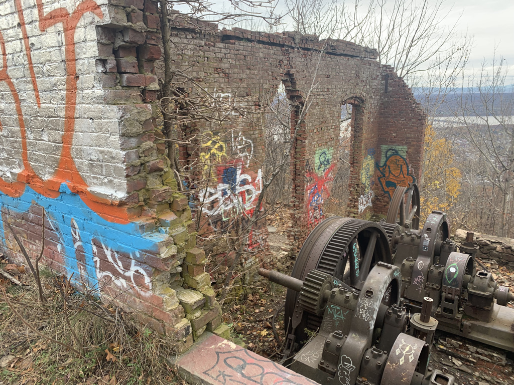 Shortly past the trailhead, you can see the remnants of the train that used to take people up the casino that greets you at your first landing. Here, we start our steep mile climb, first with a long set of metal stairs. While there’s traction, the leaves this time of year make things awfully slippery. A quick view to take in, then into the woods.